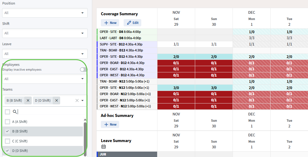 You can now filter by multiple employees or multiple teams to give you an easy view of requested trades or possible reassignments to fill gaps.