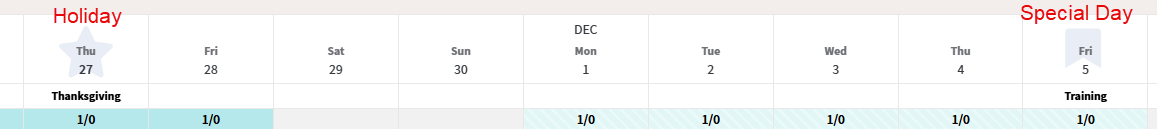 Holidays and Special Days can be added to the system to give visual indicators on the schedule. Holidays often have rules and workflows associated with them, so special days should be used for other noteworthy events like training or special events.