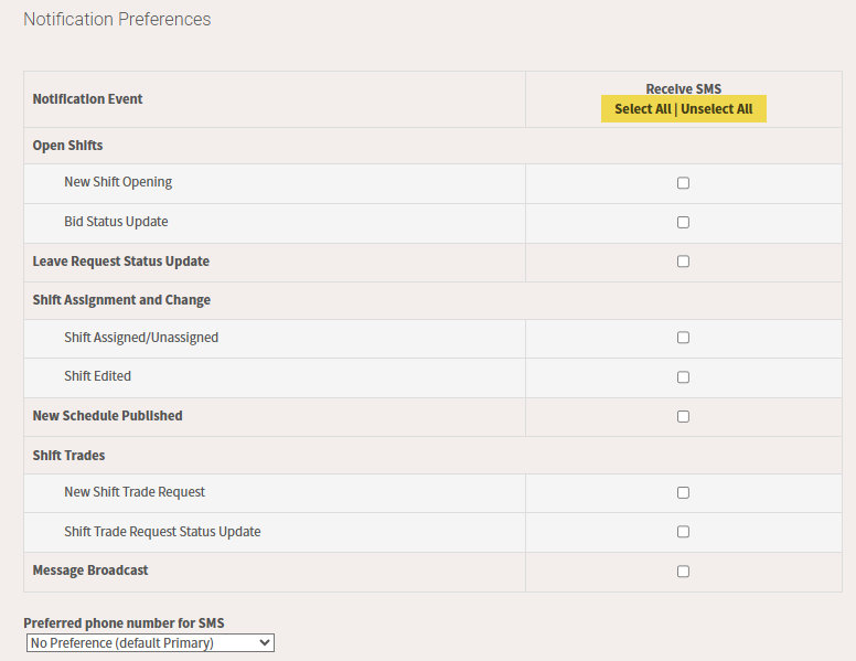 The experience has changed slightly for employees and how their notification preferences are updated. This still relies on whether they have access to edit their own, but there is an option to select all or unselect all of SMS options at once.