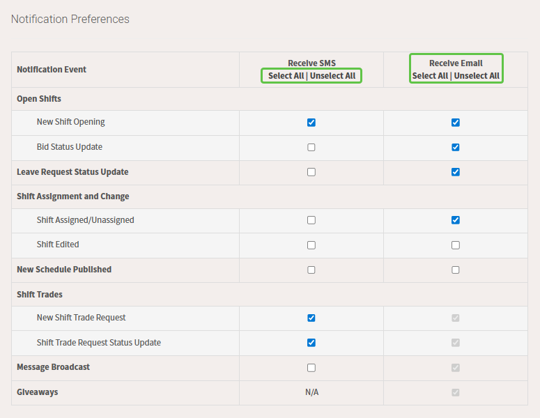 Individual employee notification settings can be set on employee profiles. This page is available to employees who have access to edit their own notifications. They can disable specific SMS or email notifications and use select / unselect all. The notification preferences only apply to employee level notifications, not approval manager notifications.