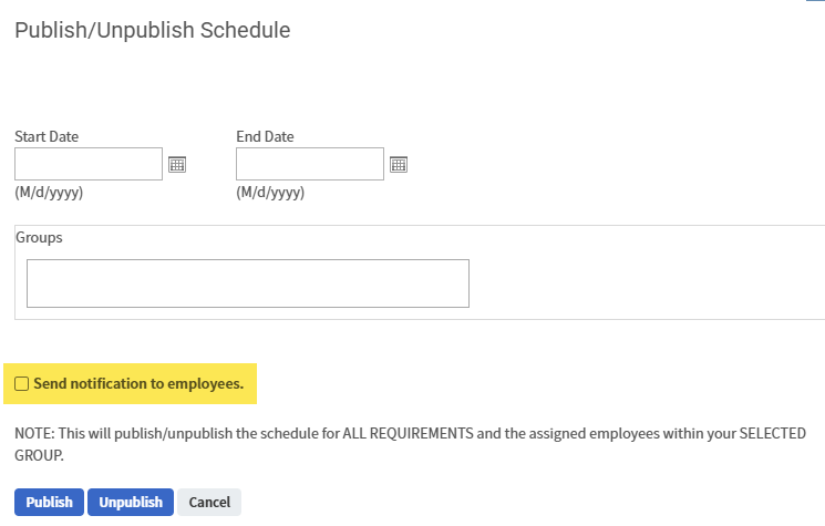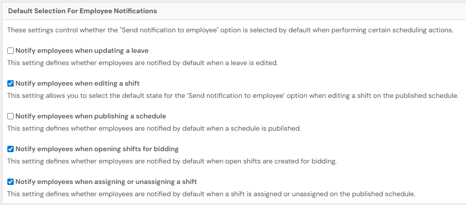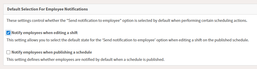 System administrators can set defaults for notifying employees when editing a shift or publishing a schedule. Go to Home > Settings > Organization > Default Selection for Employee Notifications.