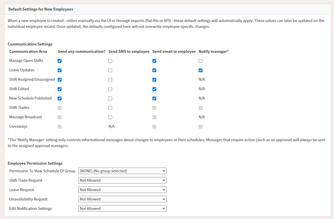 System administrators in SchedulePro can set up the default notification settings for all new employees entered into the system. These are set under Home > Settings > Organization > Default Settings for New Employees.